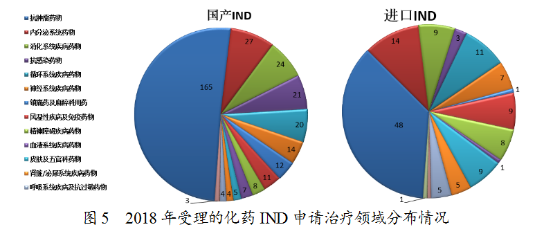藥審中心受理化藥IND申請457件,其中受理國產(chǎn)化藥IND申請325件,受理進(jìn)口IND申請132件。國產(chǎn)化藥IND申請的適應(yīng)癥主要集中在抗腫瘤、內(nèi)分泌系統(tǒng)和消化系統(tǒng)領(lǐng)域。進(jìn)口IND申請的適應(yīng)癥主要集中在抗腫瘤、內(nèi)分泌系統(tǒng)和循環(huán)系統(tǒng)領(lǐng)域,具體治療領(lǐng)域分布詳見圖5。