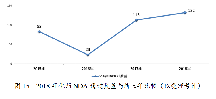 藥審中心完成審評的化藥NDA 206件,其中審評通過132件,與前三年比較(以受理號計(jì))詳見圖15,2018年完成審評的化藥各類注冊申請具體情況詳見表1。