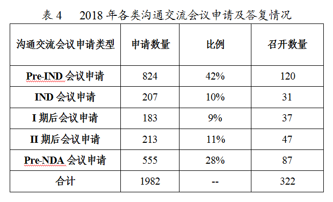 根據(jù)申請人擬溝通的問題及提交的支持性材料,經(jīng)審核評估,2018年藥審中心召開溝通交流會322次,其余均以書面形式進(jìn)行了答復(fù),2018年各類溝通交流會議申請及答復(fù)情況詳見表4。