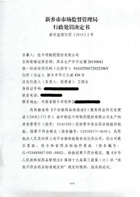 今年5月,新鄉(xiāng)市市場(chǎng)監(jiān)督管理局向佐今明制藥股份有限公司下達(dá)編號(hào)為新市監(jiān)藥行罰【2019】2號(hào)行政處罰決定書(shū),認(rèn)定貴司生產(chǎn)、銷(xiāo)售批號(hào)為32161202消食養(yǎng)胃片為劣藥,依法查處涉案產(chǎn)品5961盒,并在該局的監(jiān)督下銷(xiāo)毀該批次召回藥品。