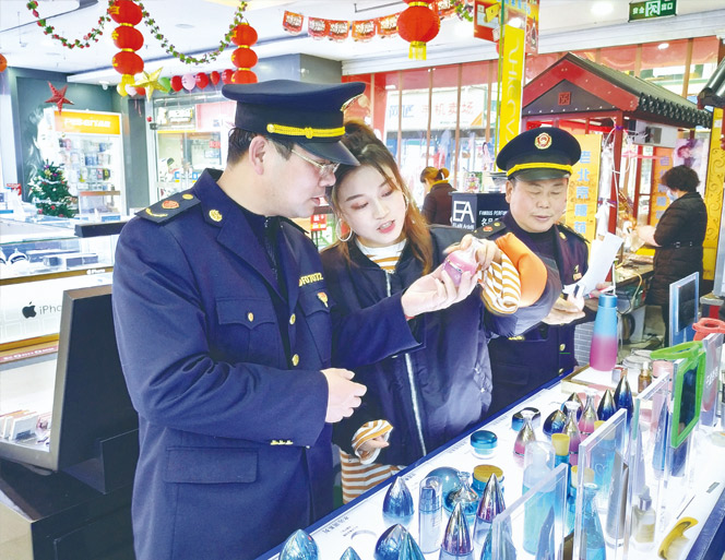 圖為執(zhí)法人員在超市化妝品專柜檢查化妝品標(biāo)簽標(biāo)識情形。鄢國卿 袁智 攝影報(bào)道