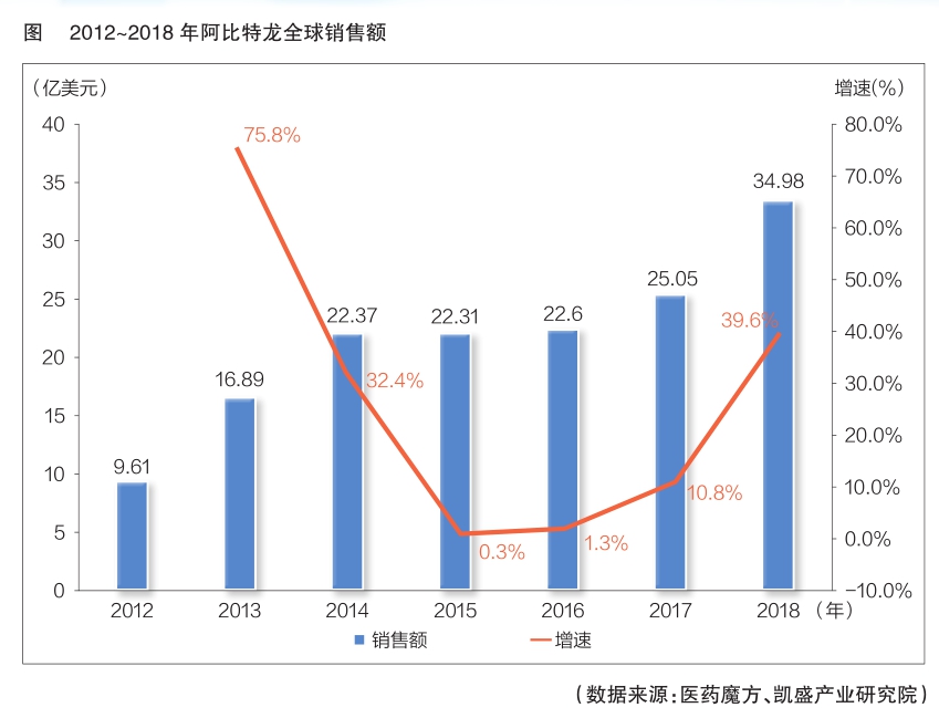 2018年,阿比特龍全球銷售額達34.98億美元,相比2017年的25.05億美元增長近40%,這主要得益于其治療mHSPC的適應證在2018年初獲批(見圖)。但隨著阿比特龍的專利在2018年10月到期,其未來的銷售額將受到仿制藥的沖擊。
