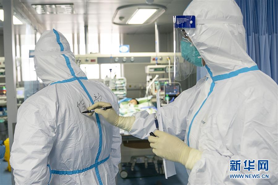 1月24日,在武漢大學(xué)中南醫(yī)院重癥隔離病房,醫(yī)護人員在隔離服上寫下名字,方便辨認。新華社記者 熊琦 攝