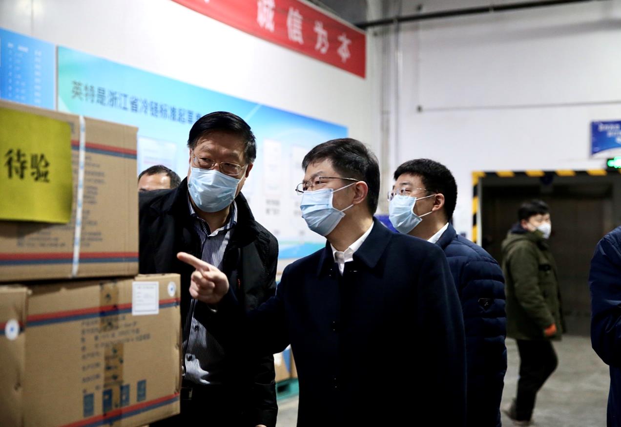 浙江省藥監(jiān)局黨組書記、局長徐潤龍(前排右)一行赴英特集團(tuán)物流倉庫開展現(xiàn)場辦公,協(xié)調(diào)解決醫(yī)用防護(hù)用品供應(yīng)保障問題。(浙江省藥監(jiān)局供圖)