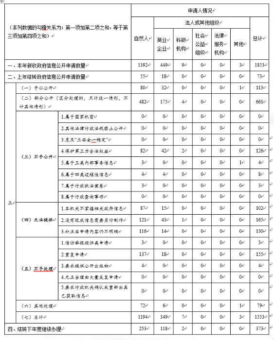 一是申請情況。2019年,新收到有效依申請公開事項1853件,其中,申請人為自然人1392件,占75.1%;申請人為商業(yè)企業(yè)449件,占24.2%;申請人為科研機構9件,占0.5%。從申請渠道來看,通過在線平臺申請1585件,占85.5%;以信函形式申請225件,占12.1%;以傳真形式申請31件,占1.7%;當面遞交申請12件,占0.7%。