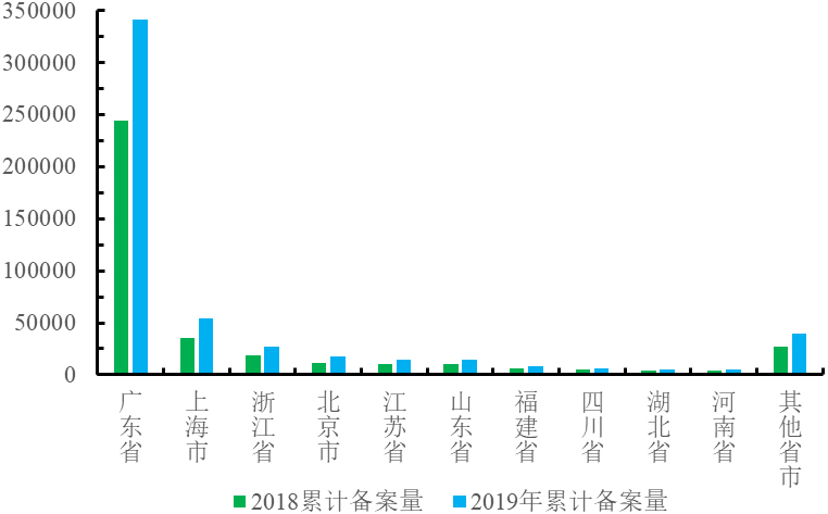 2018年~2019年國(guó)內(nèi)主要省市非特化妝品備案數(shù)量