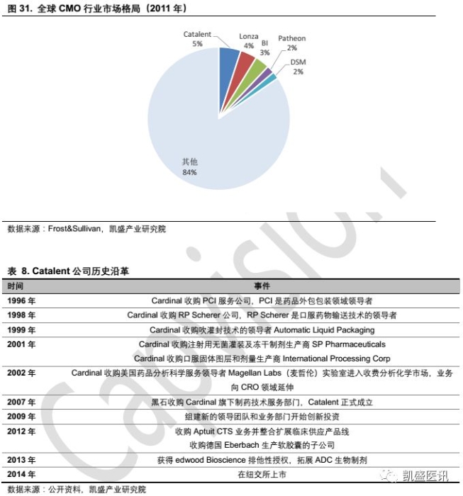 中國食品藥品網(wǎng)訊 協(xié)助各大藥企有效降低成本、提升研發(fā)效率的醫(yī)藥外包服務(wù)已成為制藥產(chǎn)業(yè)鏈中不可缺失的一環(huán),全球醫(yī)藥外包服務(wù)產(chǎn)業(yè)在40多年時間里迅速成長為了市場規(guī)模超千億美元的產(chǎn)業(yè)。以腫瘤藥/孤兒藥+Biotech為驅(qū)動力的本輪全球新藥研發(fā)潮,給全球新藥研發(fā)外包行業(yè)帶來了新的動力。 分析國際巨頭CRO及CMO公司的發(fā)展路徑可以發(fā)現(xiàn),行業(yè)內(nèi)的重組兼并將是行業(yè)發(fā)展的必然趨勢,頭部企業(yè)將利用自身的資本優(yōu)勢,通過收購、合并加速業(yè)務(wù)范圍拓展及產(chǎn)能建設(shè),打造全方位一體化服務(wù)平臺,持續(xù)滿足不同客戶的需求,以穩(wěn)固行業(yè)龍地位。 LabCorp、IQVIA兩大收入過百億美元CRO的發(fā)展路徑——外延并購加速一體化平臺建設(shè),市場與服務(wù)范圍的雙重拓寬迅速打開公司成長天花板。 相較于較為分散的國內(nèi)CRO市場,全球CRO市場集中度較高,以收入計2017年TOP6企業(yè)所占市場份額為56%。在早期,LabCorp、IQVIA等全球TOP10 CRO&CMO企業(yè)均以服務(wù)范圍較小的單一服務(wù)起家,伴隨全球醫(yī)藥行業(yè)精細化分工趨勢的不斷加深,這些公司在成長的過程中不斷積累資金,通過收購合并策略快速拓展業(yè)務(wù)及客戶范圍。2017年,LabCorp與IQVIA全球市場所占份額已近乎三分之一,其中LabCorp占 20%,IQIVA 占18%. 醫(yī)療診斷服商LabCorp于2015年完成了醫(yī)藥外包行業(yè)最大規(guī)模的收購,以61億美元對Covance進行了收購,自此成為全球醫(yī)藥外包行業(yè)排名第一的龍頭企業(yè)(僅以原Covance業(yè)務(wù)收入進行計算)。 Covance的前身于1968年成立于美國,主要提供實驗動物相關(guān)設(shè)備,1972年該公司收購了毒性測試提供商Hazleton Laboratories并改名Hazleton,隨后公司逐漸發(fā)展成為美國最大的生物測試公司和生命科學實驗室,可為藥物、化妝品、農(nóng)藥、化工產(chǎn)品提供相關(guān)獨立測試服務(wù)。之后,公司與臨床服務(wù)公司Besselaar及SciCor共同成為康寧玻璃旗下的醫(yī)藥服務(wù)部門。1996年4月,康寧拆分了相關(guān)實驗室和制藥服務(wù)公司,組建了兩家新公司Quest Diagnostics和Covance,Covance作為獨立公司1997年1月在紐交所上市。Covance公司上市后開始了不斷的收購擴張之路,業(yè)務(wù)范圍也逐漸從毒理測試擴大至藥物發(fā)現(xiàn)、臨床研究、中心實驗室、生物標記物分析、市場咨詢、CMC服務(wù)等。在長達五十年的發(fā)展過程中,Covance公司不斷通過對外進行收購合并成為了全球服務(wù)范圍最為全面的醫(yī)藥外包企業(yè)之一。 Catalent、Lonza兩大CMO的發(fā)展路徑——通過收購合并加速業(yè)務(wù)拓展及產(chǎn)能建設(shè),全方位服務(wù)平臺奠定絕對龍頭地位。 全球CMO行業(yè)集中度較低,TOP5企業(yè)市場份額總額僅16%。 Catalent(康泰倫特)成立于2007年,總部位于美國的特拉華州,是美國最大的醫(yī)藥定制研發(fā)生產(chǎn)企業(yè),主要提供先進的藥物傳輸技術(shù)、生物制品和健康產(chǎn)品的開發(fā)解決方案,其曾參與50%以上的美國FDA批準的新藥項目的研發(fā)及生產(chǎn)。Catalent的業(yè)務(wù)最早可追溯到1996年,當時的Cardinal公司收購了藥物外包裝業(yè)務(wù)領(lǐng)先公司PCI。在些之后的1998-2002年間,又陸續(xù)收購了RP Scherer、AutomaticLiquid Packaging,SPPharmaceuticals等公司,獲得了全球領(lǐng)先的口服藥物輸送、吹灌封技術(shù)、無菌灌裝技術(shù)、口服固體涂層技術(shù),逐漸成長為CMO領(lǐng)域的龍頭企業(yè)。2007年,Cardinal 的CMO業(yè)務(wù)被收購后被獨立出來,Catalent正式成立。自此,Catalent利用自身資本優(yōu)勢走上了通過兼并收購不斷擴大業(yè)務(wù)范圍的快速成長路徑。 Lonza(龍沙)集團是一家具有100多年歷史,總部位于瑞士巴塞爾,以生命科學為主導,在生物化學、精細化工、功能化學等行業(yè)均處于領(lǐng)先地位的全球性跨國公司。2017年,龍沙在全球有14618名員工,在全球三大洲建有29個主要生產(chǎn)基地。 20世紀90年代之前,一些大型醫(yī)藥公司通過利用過剩的產(chǎn)能提供生產(chǎn)服務(wù),這是最初CMO服務(wù)的雛形。在當時的行業(yè)環(huán)境下,Lonza利用API業(yè)務(wù)成功進入了CMO行業(yè)。1990-2007年期間,該公司先后收購了一家捷克的生物技術(shù)工廠、CellTech Biologics、UCB生物產(chǎn)品制造部門、Cambrex生物產(chǎn)品和生物制藥業(yè)務(wù)及Cambrex旗下生物試劑業(yè)務(wù)等。2008-2013年期間,在經(jīng)濟寒冬下,CMO行業(yè)進行了重新洗牌,Lonza借機發(fā)動了密集的連續(xù)性并購,使其業(yè)務(wù)鏈向藥物發(fā)現(xiàn)等前端延伸,同時繼續(xù)擴大新型生物藥的產(chǎn)能,成為了全球CMO行業(yè)不可撼動的生物制劑醫(yī)藥外包龍頭企業(yè)。