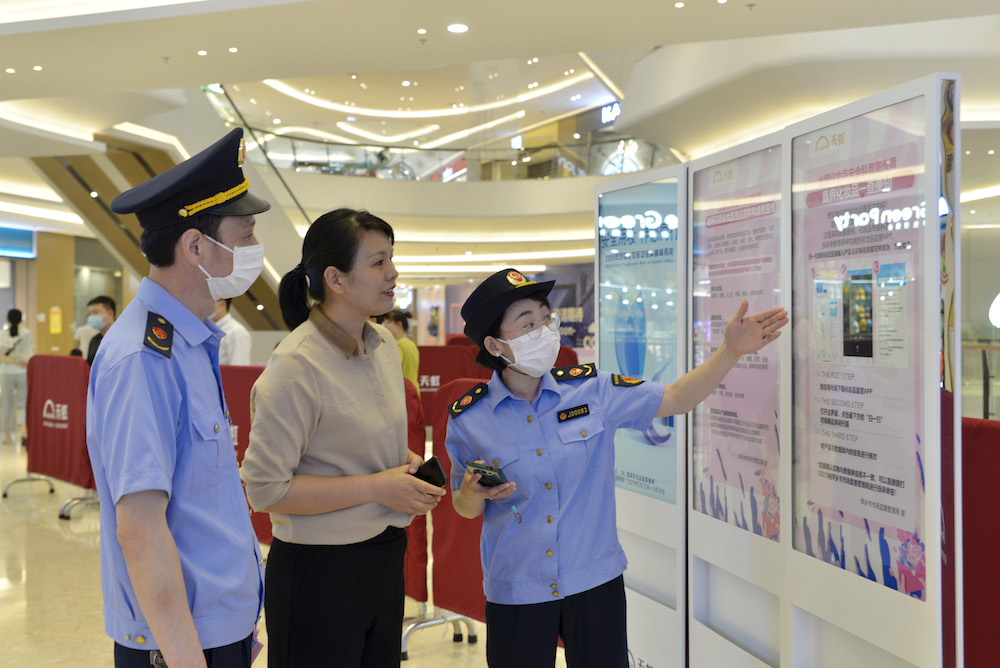 5月25日晚,該局干部在萍鄉(xiāng)天虹購(gòu)物中心向消費(fèi)者講解化妝品用妝安全知識(shí)。(黃躍輝 攝)