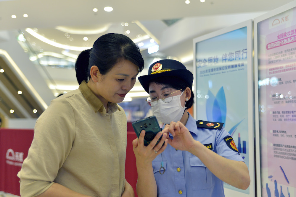 5月25日晚,該局干部向企業(yè)代表推廣化妝品監(jiān)管APP,并告知如何在手機(jī)下載使用。(黃躍輝 攝)