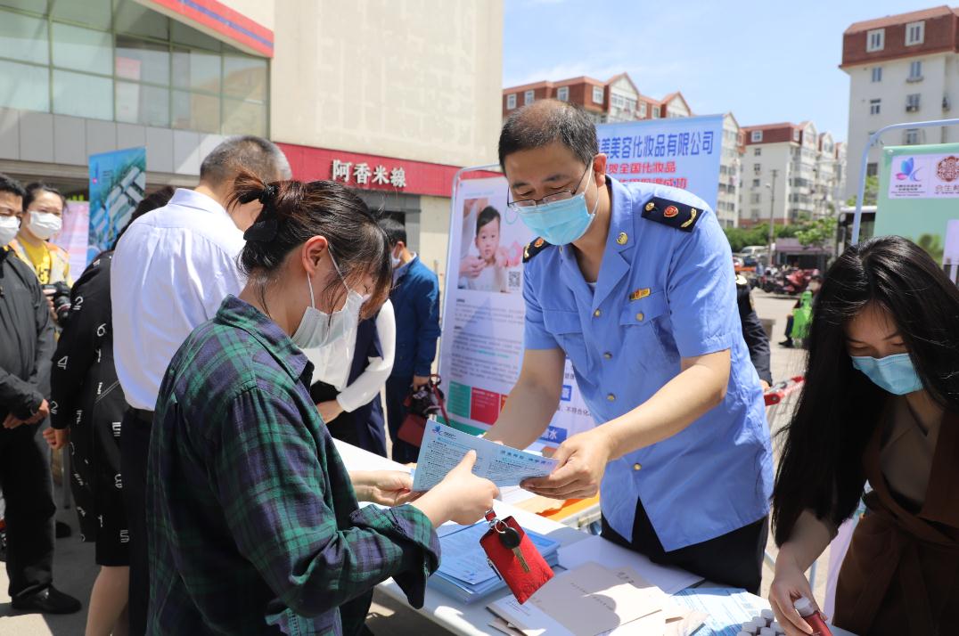 在青島市化妝品安全科普宣傳周啟動儀式上,工作人員現(xiàn)場回答群眾咨詢。(山東省藥監(jiān)局供圖)