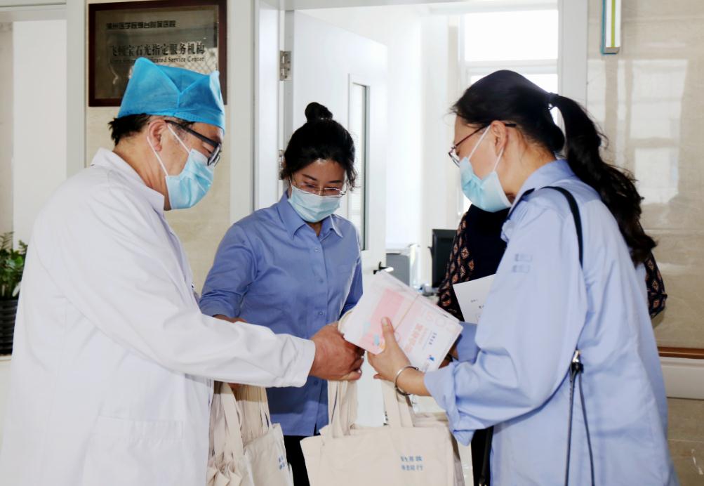 煙臺市牟平區(qū)市場監(jiān)管局工作人員前往當?shù)夭涣挤磻邳c醫(yī)院發(fā)放宣傳手冊,并與該院皮膚科大夫就化妝品不良反應相關(guān)工作進行溝通。(山東省藥監(jiān)局供圖)
