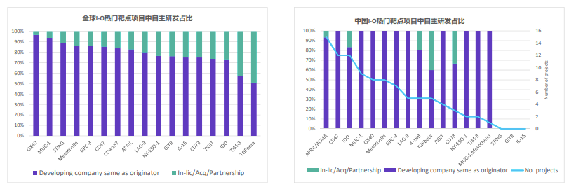 中國公司強調(diào)自主研發(fā),78%的熱門靶點項目都是由發(fā)起該項目的同一家公司開發(fā),僅7%來自合作。聯(lián)合用藥成為大趨勢,所有靶點均聯(lián)用PD1/L1抑制劑,另有一半聯(lián)用CTLA-4。