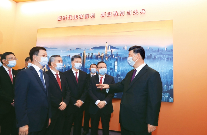 2020年10月14日,深圳經(jīng)濟(jì)特區(qū)建立40周年慶祝大會在廣東省深圳市隆重舉行。中共中央總書記、國家主席、中央軍委主席習(xí)近平在會上發(fā)表重要講話。這是當(dāng)天上午,習(xí)近平等參觀“從先行先試到先行示范——慶祝深圳經(jīng)濟(jì)特區(qū)建立40周年展覽”。新華社記者 鞠鵬/攝