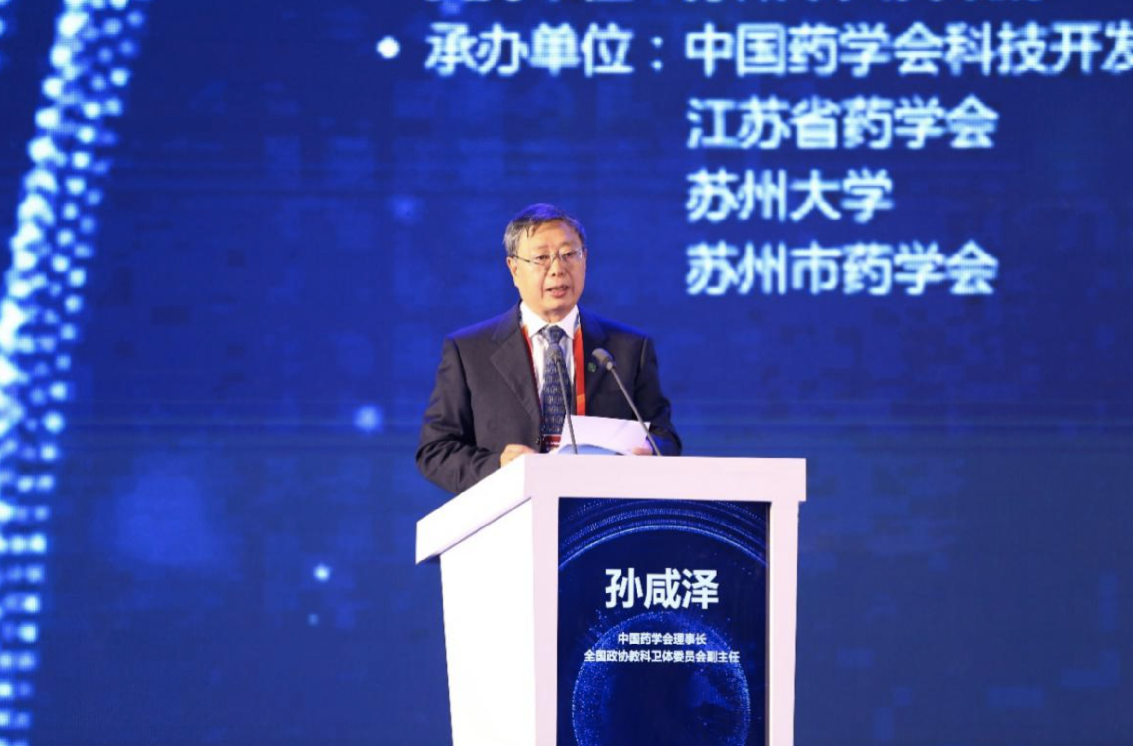 圖為中國藥學(xué)會理事長、全國政協(xié)教科衛(wèi)體委員會副主任孫咸澤致辭。