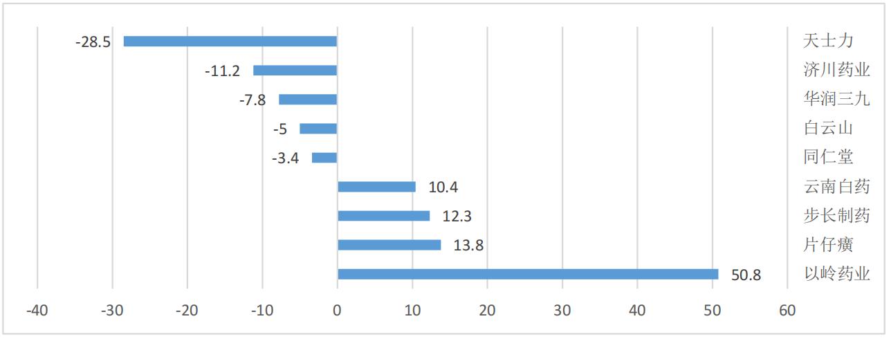圖4 9家中藥公司2020年總營收增幅對比(單位:百分比)