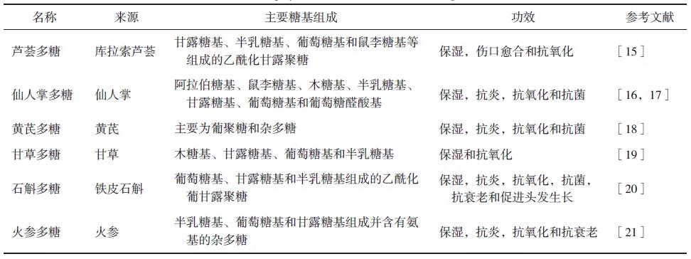 在高等植物中,蘆薈提取物是化妝品中廣泛應用的保濕原料。許多保濕化妝品中都含有蘆薈提取物。蘆薈提取物的主要活性成分是蘆薈多糖(表1),除了具有很好的保濕作用,蘆薈多糖具有一定的粘性和凝膠性,對皮膚傷口的愈合和干燥皮膚的修復也具有很好的效果;另外,蘆薈多糖對特應性皮炎也有一定的功效。仙人掌提取物中的多糖由中性多糖,酸性多糖和酸性糖蛋白組成,仙人掌多糖不僅可以水合吸收和維持皮膚的水分,而且具有抗炎和促進傷口愈合等功效。大部分水溶性植物多糖如黃芪多糖、甘草多糖、石斛多糖和火參多糖等都有很好的水合吸收水分的特性,具有很好的保濕性和成膜性,在保持皮膚水分、提高角質(zhì)層的保濕等具有很好的效果,也都具有抗氧化活性等功效。
