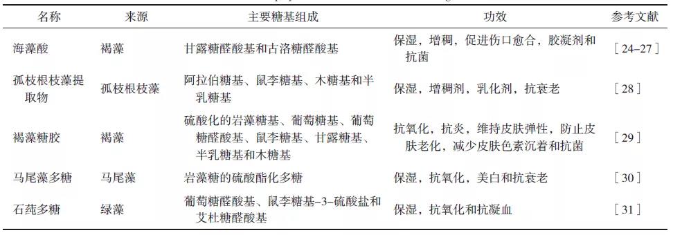 海藻中也存在大量的多糖,不同海藻中的多糖類型也有所不同,許多海藻多糖具有很好的水合吸濕性和保持水分的能力。與透明質(zhì)酸相比,一些大型藻類的低分子多糖表現(xiàn)出高吸收和保持水分的能力。海藻酸是來自褐藻的多糖(表2),海藻酸在化妝品中不僅可作為保濕劑,也可作為穩(wěn)定劑和膠凝劑。海藻酸能迅速吸收水分,也可以通過離子-離子的相互作用形成保護性的保濕復合物,具有很好的吸濕和水化的特性,從而有助于增加皮膚的水分,改善皮膚的彈性。在二價陽離子的存在下,海藻酸鹽具有很好的凝膠特性和離子螯合作用;海藻酸鹽配制的面膜中,海藻酸鹽形成了對皮膚吸附性更好的柔性膜。另外,藻類提取物如孤枝根枝藻提取物具有類似透明質(zhì)酸的保濕功效,保濕效果好而且持久;褐藻糖膠通過水合作用改善了皮膚的彈性;馬尾藻多糖中的羥基和水形成分子間的氫鍵促進了其對水分的吸收,而且馬尾藻多糖的保濕效果隨著硫酸根含量的增加而增加;石莼多糖不僅具有保濕性,而且有抗氧化和抗凝血等活性。