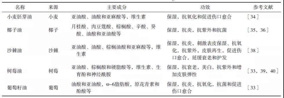 不飽和脂肪酸是植物油的主要成分。小麥胚芽油除了不飽和脂肪酸,還富含維生素(表3),小麥胚芽油添加到化妝品配方中,在皮膚上形成一個封閉層,防止水分丟失,增加保濕效果,并且對干燥粗糙的皮膚也具有促進皮膚再生的作用。另外,小麥胚芽油與一些植物提取物復配后協(xié)同作用更好,對預防皮膚干燥非常有效。許多植物油不僅具有保濕作用,容易被皮膚吸收,有很好的涂抹性,而且也具有多種生物活性。椰子油是一種溫和的保濕劑;椰子油能夠增加水通道蛋白AQP3、整合蛋白和絲聚蛋白的表達水平,在角質(zhì)形成細胞分化和皮膚屏障中發(fā)揮作用,從而改變了皮膚屏障功能;椰子油和橄欖油復配,通過封閉減緩經(jīng)表皮的水分丟失,具有更好地保護皮膚的作用;椰子油作為潤膚劑,也是手工皂和一些洗滌劑不可缺少的油脂之一。沙棘油在化妝品配方中不僅具有保濕作用,還具有皮膚修復和再生的功效,也能保護、再生和軟化角質(zhì)層,緩解炎癥,確保皮膚細胞間的結(jié)構(gòu)穩(wěn)定;沙棘油適用于干燥、粗糙、剝落、瘙癢或刺激性的皮膚。添加沙棘油的洗發(fā)香波和護發(fā)素等,可以促進受損頭發(fā)的再生,恢復頭發(fā)的彈性和平滑。另外,樹莓油是一種很好的化妝品基礎(chǔ)油,不僅促進皮膚的水合作用和保持水分,避免表皮水分蒸發(fā),而且加強表皮的脂質(zhì)屏障,改善皮脂腺,適合應用于一些皮膚病如銀屑病和酒糟鼻。葡萄籽油含有大量的ω-6脂肪酸,對于干性皮膚能夠再生表皮的脂質(zhì)屏障,防止水分過度丟失;對油性和脂溢性皮膚可改善粉刺和皮脂腺正?;?/p>