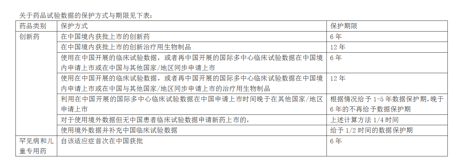 關(guān)于藥品試驗數(shù)據(jù)的保護方式與期限見下表:
