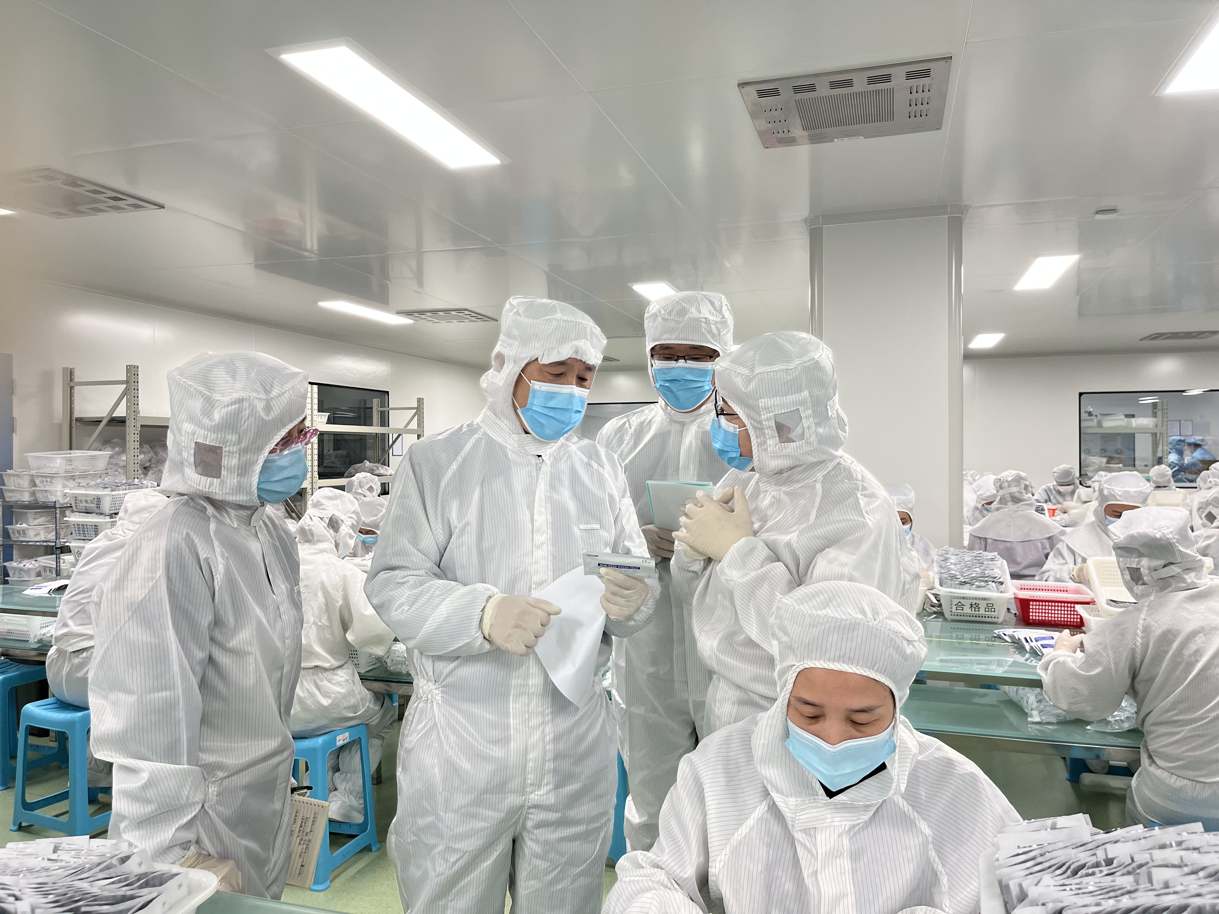 圖為山東省藥監(jiān)局區(qū)域檢查第二分局執(zhí)法人員在康華生物新冠病毒抗原檢測(cè)試劑盒生產(chǎn)現(xiàn)場(chǎng)檢查指導(dǎo)。(仲勇軍 攝)