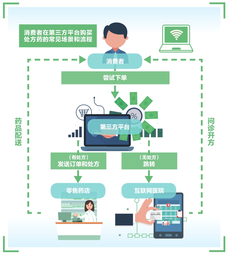 通常而言,消費(fèi)者在第三方平臺(tái)購(gòu)買(mǎi)處方藥的場(chǎng)景和流程如下圖。