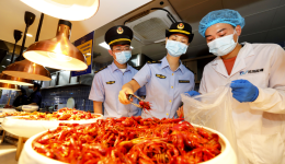 圖為8月2日,淮北市市場監(jiān)督管理部門工作人員在夜市餐飲街區(qū)現(xiàn)場取樣。