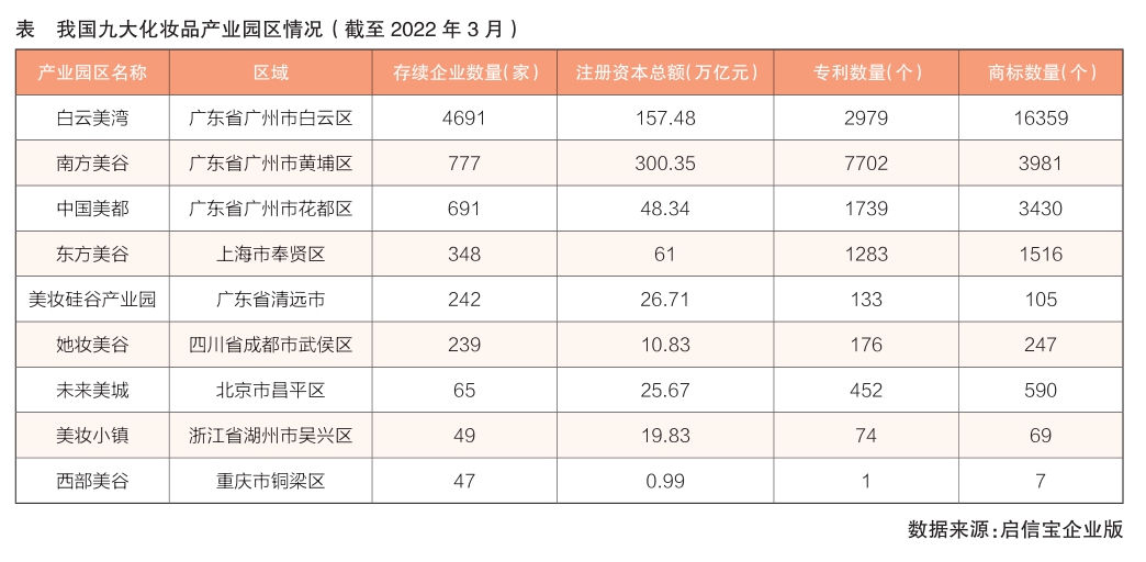 除上述7個(gè)化妝品產(chǎn)業(yè)園區(qū)外,還有廣東省清遠(yuǎn)市的“美妝硅谷產(chǎn)業(yè)園”和四川省成都市的“她妝美谷”,共同構(gòu)成我國(guó)9個(gè)主要化妝品產(chǎn)業(yè)園區(qū),總存續(xù)企業(yè)數(shù)量達(dá)7149家,包括研發(fā)、生產(chǎn)、設(shè)計(jì)、包裝、營(yíng)銷等各類企業(yè)。其中,廣州的“白云美灣”“南方美谷”和“中國(guó)美都”不僅存續(xù)企業(yè)數(shù)量遙遙領(lǐng)先,且注冊(cè)資本總額、獲得專利數(shù)量和商標(biāo)數(shù)量也均位居國(guó)內(nèi)前三(詳見(jiàn)表)。