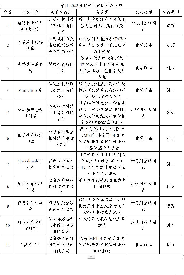 綜上所述,2022年共12件創(chuàng)新藥被納入優(yōu)先審評(píng)名單,覆蓋11個(gè)品種,如表1所示。其中,包括5種化學(xué)藥品和6種治療用生物制品;4種創(chuàng)新藥為進(jìn)口藥品,其他均來自本土藥企。