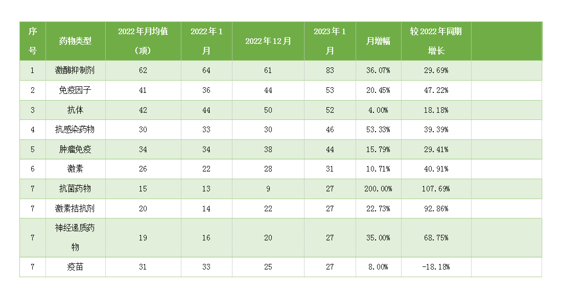 對(duì)新增藥物類型臨床試驗(yàn)進(jìn)行統(tǒng)計(jì)后發(fā)現(xiàn), 1月份熱門藥物類型臨床試驗(yàn)數(shù)量均呈現(xiàn)上升趨勢(shì),增長(zhǎng)幅度最大的藥物門類為抗菌藥物,較上月上升107.69%;其次為抗感染藥物,上升幅度為53.33%。相較于去年同期水平,僅有疫苗類產(chǎn)品臨床試驗(yàn)出現(xiàn)下降,下降幅度為18.18%。(詳見表2)