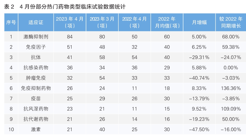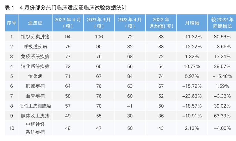 從4月份新增臨床試驗(yàn)熱門適應(yīng)證領(lǐng)域來看,組織分類腫瘤仍為最主要的熱門研發(fā)領(lǐng)域,試驗(yàn)數(shù)量為94項(xiàng),相較3月份下降11.32%;其次為呼吸道疾病領(lǐng)域,數(shù)量相較于上月下降12.22%。月降幅最高的熱門適應(yīng)證為血管疾病,單月降幅為23.68%。相較于上月,4月份熱門領(lǐng)域臨床試驗(yàn)數(shù)量增長最快的為消化系統(tǒng)疾病領(lǐng)域,月增幅為10.77%;其次為傳染病領(lǐng)域,月增幅為5.97%。相較于去年同期,同比增幅最為顯著的為腺體及上皮瘤,為63.33%;同比降幅最高的為15.48%,為傳染病領(lǐng)域。