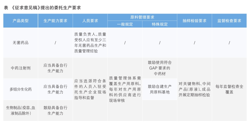 今年5月,國家藥監(jiān)局綜合司發(fā)布《關(guān)于加強(qiáng)委托生產(chǎn)藥品上市許可持有人監(jiān)管工作的通知(征求意見稿)》(以下簡稱《征求意見稿》)并公開征求意見,《征求意見稿》對(duì)委托生產(chǎn)的持有人從許可管理、質(zhì)量管理、監(jiān)督檢查等層面提出了更為細(xì)化的監(jiān)管要求。