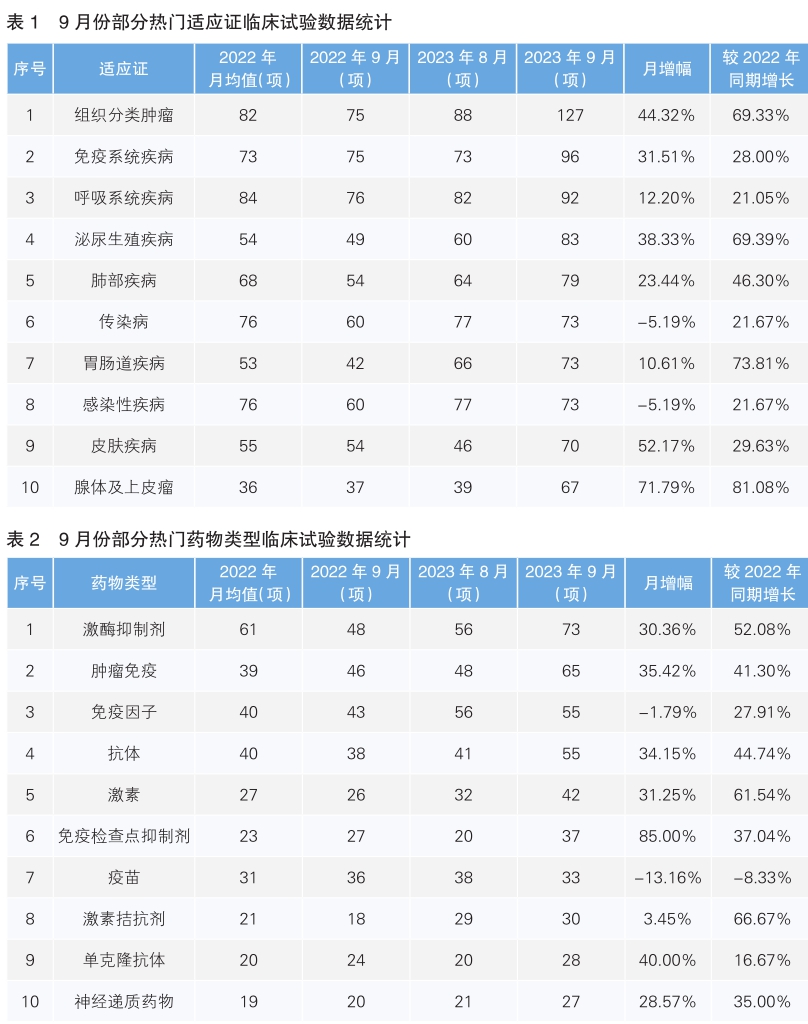 對新開臨床試驗藥物類型進行統計后發(fā)現,9月份最為熱門的藥物類型仍為激酶抑制劑,相較于上月增長了30.36%,相較于2022年同期增長了52.08%;其次為腫瘤免疫藥物,環(huán)比增幅為35.42%,同比增幅為41.3%。月增幅最高的藥物類型是單克隆抗體,月增幅為40%,相較于2022年同期增長16.67%(詳見表2)。
