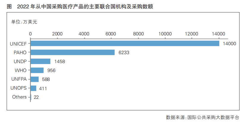 2022年,中國在聯(lián)合國采購中供應(yīng)了5億美元的產(chǎn)品,占聯(lián)合國采購總額的1.69%,排名由2021年的第3名跌至第15名。2022年共有13個(gè)聯(lián)合國機(jī)構(gòu)從中國采購醫(yī)療產(chǎn)品,采購額達(dá)2.29億美元。其中,最主要的采購類別為醫(yī)療器械及設(shè)備,采購額為1.4億美元;其后是藥品、避孕藥具和疫苗,采購額為8900萬美元。UNICEF的采購金額最高,達(dá)1.4億美元,占比高達(dá)61%。