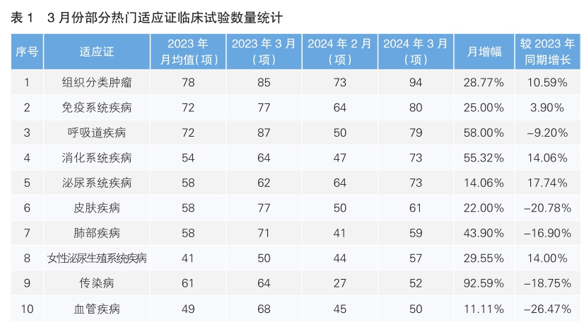 從3月份新增臨床試驗(yàn)熱門適應(yīng)證領(lǐng)域來(lái)看,組織分類腫瘤仍為最主要的熱門研發(fā)領(lǐng)域,試驗(yàn)數(shù)量為94項(xiàng),相較2月份增長(zhǎng)28.77%;其次為免疫系統(tǒng)疾病,環(huán)比增長(zhǎng)25%。月增幅最高的熱門適應(yīng)證為傳染病,單月增幅為92.59%。月增幅最低的熱門適應(yīng)證為血管疾病,單月增幅為11.11%。相較于2023年同期,同比增幅最為顯著的為泌尿系統(tǒng)疾病,增長(zhǎng)17.74%;同比降幅最為顯著的是血管疾病,降幅為26.47%。(詳見表1)