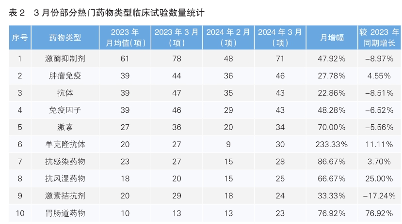 對(duì)新增臨床試驗(yàn)藥物類型進(jìn)行統(tǒng)計(jì)后發(fā)現(xiàn),3月份最為熱門的藥物類型仍為激酶抑制劑,環(huán)比增長(zhǎng)47.92%,但同比下降了8.97%;其次為腫瘤免疫藥物,環(huán)比增長(zhǎng)27.78%,同比增長(zhǎng)4.55%。月增幅最高的藥物類型為單克隆抗體藥物,增幅為233.33%,同比增長(zhǎng)了11.11%。相較于2023年同期月降幅最大的藥物類型是激素拮抗劑,同比下降了17.24%。(詳見表2)