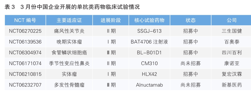 根據(jù)美國(guó)Clinicaltrial數(shù)據(jù)庫(kù)數(shù)據(jù),2024年3月份,全球新增由企業(yè)資本主導(dǎo)的臨床試驗(yàn)總數(shù)為733項(xiàng),新開臨床試驗(yàn)數(shù)量顯著上升,較2月份增長(zhǎng)27.04%。單月新增臨床試驗(yàn)數(shù)量低于2023年同期水平,同比下降5.66%。值得注意的是,當(dāng)月圍繞單抗藥物新開展的臨床試驗(yàn)數(shù)量大幅上升,其中有6項(xiàng)由中國(guó)企業(yè)開展。
