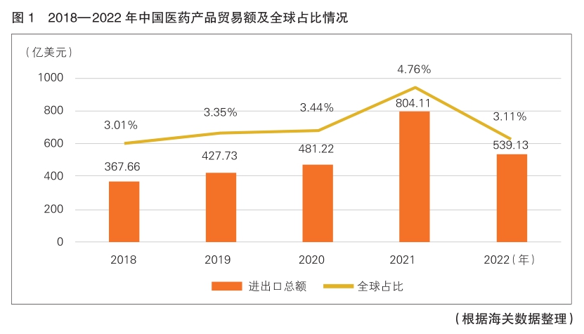 聯(lián)合國(guó)有關(guān)機(jī)構(gòu)統(tǒng)計(jì)數(shù)據(jù)顯示,2018—2022年的五年間,中國(guó)醫(yī)藥產(chǎn)品貿(mào)易總額由367.66億美元升至539.13億美元,全球占比穩(wěn)定在3.5%左右,全球排名由第十位升至第九位(詳見(jiàn)圖1)。