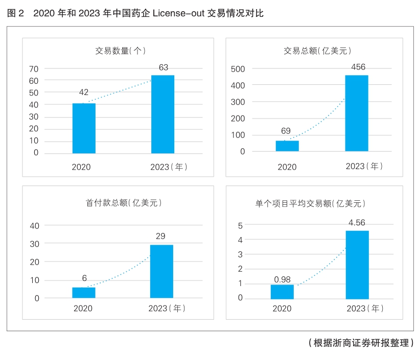 據(jù)雅法全球醫(yī)療(YAFA)報(bào)告統(tǒng)計(jì),2023年中國(guó)藥企共計(jì)進(jìn)行了63筆License-out交易,同比增長(zhǎng)80%,且數(shù)量首次超過(guò)Licensein(詳見(jiàn)圖2)。
