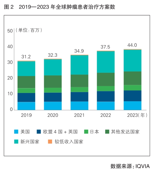 在過去五年中,新興市場和低收入市場的癌癥治療方案數(shù)量增長最快,年均復(fù)合增長率分別為12%和10%。這反映出這些地區(qū)抗癌藥物的使用范圍有所擴(kuò)大。