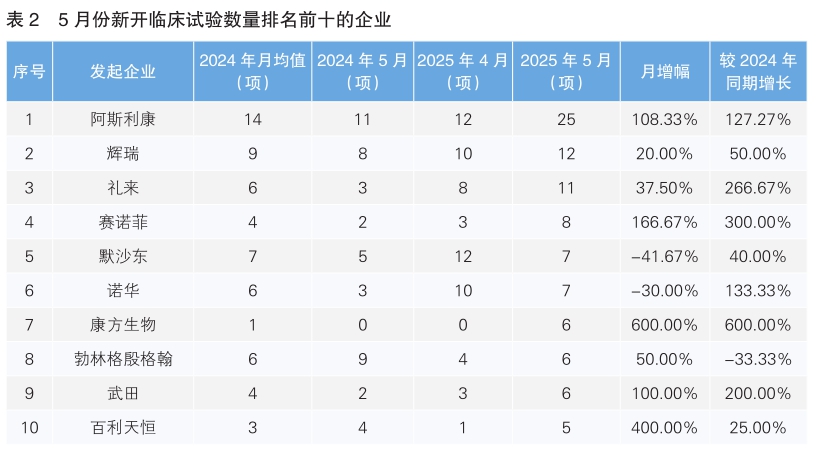 對(duì)新開(kāi)臨床試驗(yàn)的發(fā)起企業(yè)進(jìn)行統(tǒng)計(jì)后發(fā)現(xiàn),5月份發(fā)起臨床試驗(yàn)最多的企業(yè)為阿斯利康,新開(kāi)臨床試驗(yàn)25項(xiàng),環(huán)比上升108.33%,同比上升127.27%;其次為輝瑞,新開(kāi)臨床試驗(yàn)12項(xiàng),環(huán)比上漲20%,同比增長(zhǎng)50%。新開(kāi)臨床試驗(yàn)數(shù)量上升幅度最大的企業(yè)為康方生物,與其4月份相比上升了6倍。值得注意的是,這也是我國(guó)企業(yè)康方生物首次進(jìn)入新開(kāi)臨床試驗(yàn)數(shù)量排名前十榜單。(詳見(jiàn)表2)