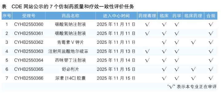 6.CDE網(wǎng)站公示7個(gè)仿制藥質(zhì)量和療效一致性評(píng)價(jià)任務(wù)(詳見表),涉及碳酸氫鈉注射液等品種。
