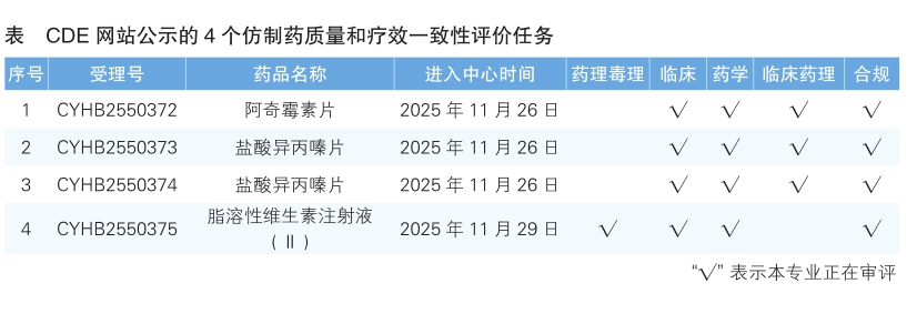 5.CDE網(wǎng)站公示4個仿制藥質(zhì)量和療效一致性評價任務(詳見表),涉及阿奇霉素片等品種。