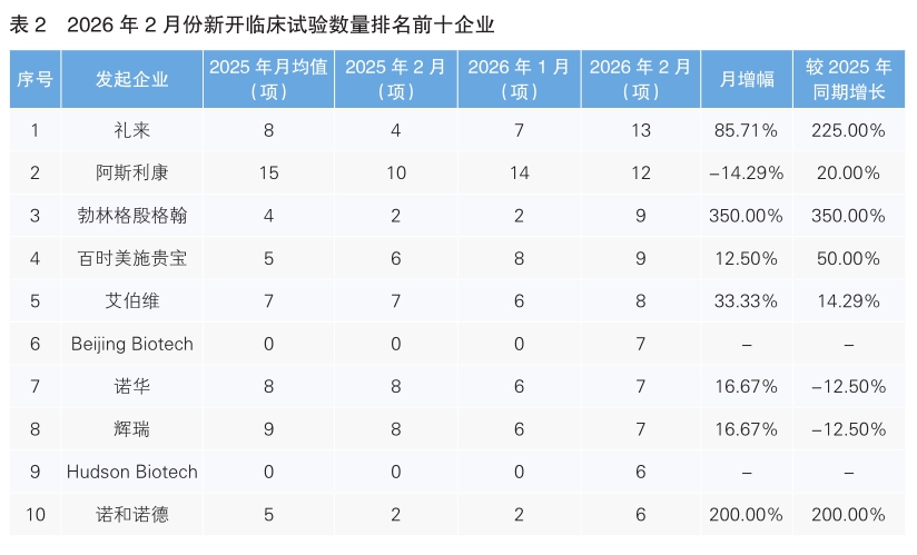 對(duì)新開(kāi)臨床試驗(yàn)的發(fā)起單位進(jìn)行統(tǒng)計(jì)后發(fā)現(xiàn),2月份發(fā)起臨床試驗(yàn)最多的企業(yè)是禮來(lái),新開(kāi)臨床試驗(yàn)13項(xiàng),環(huán)比上升85.71%,同比上漲225%。其次為阿斯利康,新開(kāi)臨床試驗(yàn)12項(xiàng),環(huán)比下降14.29%,同比增長(zhǎng)20%。新開(kāi)臨床試驗(yàn)數(shù)量上升幅度最大的企業(yè)為勃林格殷格翰,新開(kāi)臨床試驗(yàn)9項(xiàng),環(huán)比同比均增長(zhǎng)350%。(詳見(jiàn)表2)