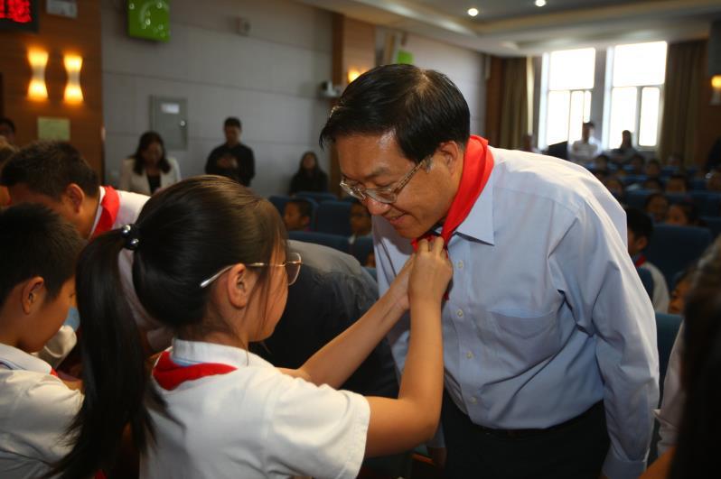 少先隊員向陳鋼敬獻(xiàn)紅領(lǐng)巾