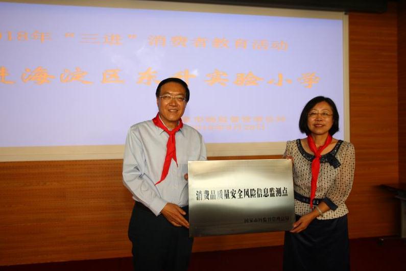 圖為陳鋼向海淀區(qū)東升實(shí)驗(yàn)小學(xué)頒授“消費(fèi)品質(zhì)量安全風(fēng)險信息監(jiān)測點(diǎn)”牌匾