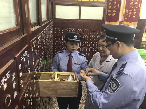 圖為10月9日?qǐng)?zhí)法人員在藥品經(jīng)營(yíng)企業(yè)檢查中藥飲片質(zhì)量。董寶栓 攝