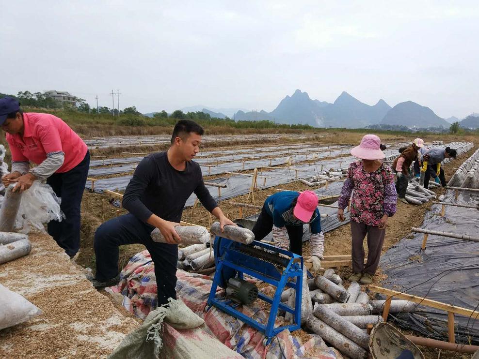鐘山縣食品藥品監(jiān)管局駐燕塘鎮(zhèn)聚義村第一書記黃升棟,想方設法幫農戶創(chuàng)業(yè),助其致富。下圖為近日黃升棟(左二)和農戶一起給黑木耳棒扎孔下地。 鐘人木 攝影報道