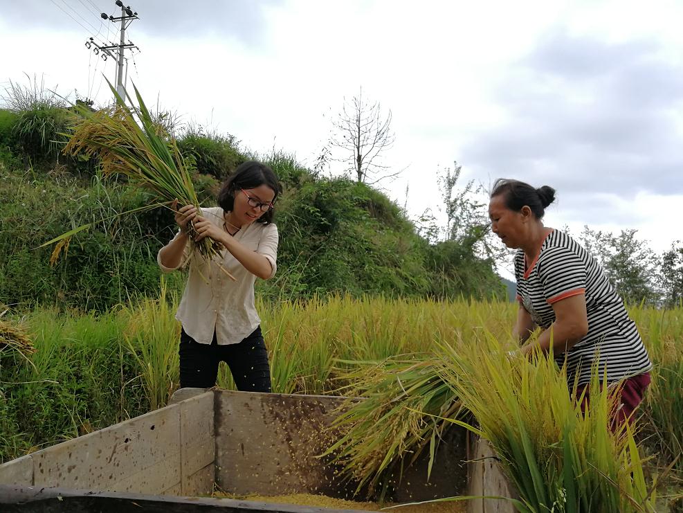 圖為駐村第一書記鄒方琴(左)放棄國慶節(jié)假期,幫貧困戶搶收稻谷。李浩然 攝