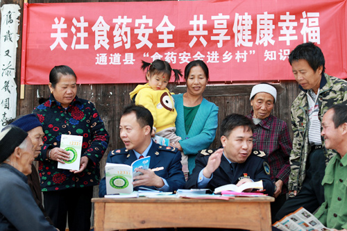 通道侗族自治縣食藥工商質(zhì)監(jiān)局監(jiān)管人員在溪口鎮(zhèn)畫筆村向村民講解食品藥品安全科普知識