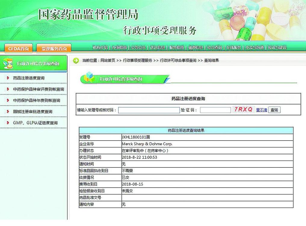 11月8日,記者以受理號(hào)JXHL1800101為例進(jìn)行查詢操作。點(diǎn)擊“行政許可綜合事項(xiàng)查詢”后,在上方“綜合查詢”-“藥品注冊(cè)進(jìn)度查詢”后的欄目中,輸入“JXHL1800101”及驗(yàn)證碼,點(diǎn)擊“提交”即可。查詢結(jié)果顯示,該品種的申請(qǐng)費(fèi)用收到日為2018年8月15日。